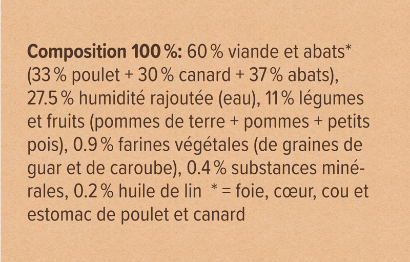 De manière générale : un aliment de haute qualité pour chiens et chats se reconnaît à une liste d’ingrédients transparente et à des additifs bien motivés. Plus la liste des ingrédients est claire et compréhensible, mieux vous pouvez évaluer la qualité de la nourriture.